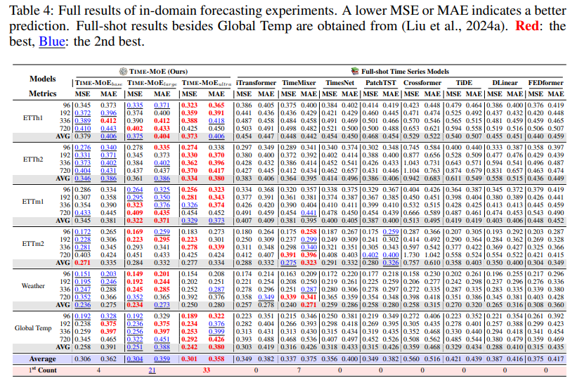 The full results are in Table 4. TIME-MOE exhibits remarkable capabilities, comprehensively surpassing advanced deep time series models from recent years, achieving a MSE reduction of 24% in average. Fine-tuning on downstream data with only one epoch significantly improves predictive performance, showcasing the remarkable potential of large time series models built on the MoE architecture. Similar to zero-shot forecasting, as the model size increases, the scaling law continues to be effective, leading to continuous improvements in the performance of the TIME-MOE.