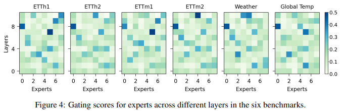 As shown in Figure 4, TIME-MOE dynamically activates different experts across various datasets, with each expert specializing in learning distinct knowledge. This leads to diverse activation patterns across datasets from different domains, showcasing TIME-MOE’s strong generalization capabilities. The heterogeneous activations indicate that the model adapts its learned representations to the specific characteristics of each dataset, contributing to its great transferability and generalization as a large-scale time series foundation model.