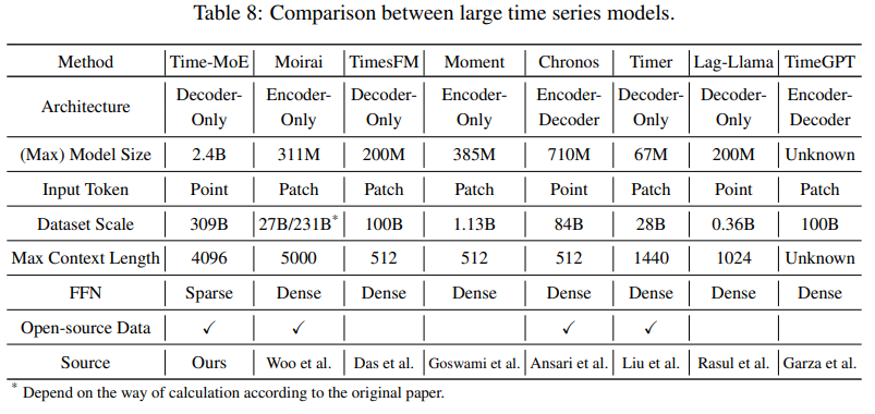 In this section, we delve deeper into the related work on large time series models. Current research efforts in universal forecasting with time series foundation models can be broadly classified into three categories, as summarized in Table 8: (1) encoder-only models, such as Moirai (Woo et al., 2024) and Moment (Goswami et al., 2024), which employ masked reconstruction and have been pre-trained on datasets containing 27B and 1B time points, respectively, with model sizes reaching up to 385M parameters; (2) encoder-decoder models, exemplified by Chronos (Ansari et al., 2024), which offers pre-trained models at four scales, with up to 710M parameters; and (3) decoder-only models, including TimesFM (Das et al., 2024), Lag-Llama (Rasul et al., 2023), and Timer (Liu et al., 2024b), with the largest models containing up to 200M parameters. In contrast to these dense models, TIME-MOE introduces a scalable, unified architecture with a sparse mixture-of-experts design, optimized for larger time series forecasting models while reducing inference costs. Trained on our Time-300B dataset, comprising over 300B time points, TIME-MOE is scaled to 2.4B parameters for the first time. It outperforms existing models with the same number of activated parameters, significantly enhancing both model efficiency and forecasting precision, while avoiding limitations such as fixed context lengths or hardcoded heuristics.