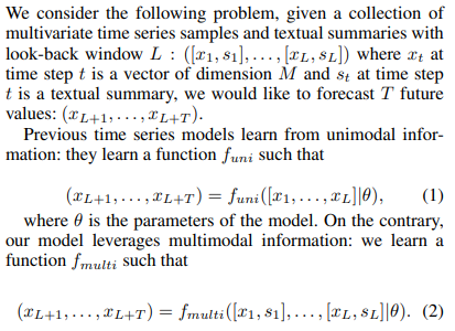 Time series data has consistently played a pivotal role in diverse felds ranging from fnance (Sezer, Gudelek, and Ozbayoglu 2020) and economics (Kalamara et al. 2022) to healthcare (Kaushik et al. 2020; Cao et al. 2023) and weather prediction (Nguyen et al. 2023), etc. The intricate patterns embedded within such data often refect underlying mechanisms or behaviors, making time series forecasting an indispensable tool for decision-making processes. Meanwhile, in our current information-dense era, the infuence of textual information spans from individual decisions to shaping national directives. However, due to insuffcient data accumulation and limited resources, limited work has been done on designing multimodal time series datasets. With the emergence of Large-scale Language Models (LLMs), we are able to fll this gap by proposing an effective pipeline and a new paradigm of time series forecasting task as well as dataset as shown in Figure 1.
