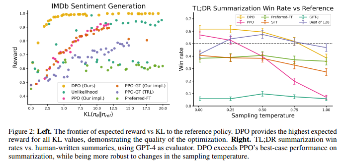 The KL-constrained reward maximization objective used in typical RLHF algorithms balances exploitation of reward while restricting the policy from deviating far from the reference policy. Therefore, when comparing algorithms, we must take into account both reward achieved as well as the KL discrepancy; achieving slightly higher reward but with much higher KL is not necessarily desirable. Figure 2 shows the reward-KL frontier for various algorithms in the sentiment setting. We execute multiple training runs for each algorithm, using a different hyperparameter for policy conservativeness in each run (target KL ∈ {3, 6, 9, 12} for PPO, β ∈ {0.05, 0.1, 1, 5}, α ∈ {0.05, 0.1, 0.5, 1} for unlikelihood, random seeds for preferred-FT). This sweep includes 22 runs in total. After each 100 training steps until convergence, we evaluate each policy on a set of test prompts, computing the average reward under the true reward function as well as the average sequence-level KL3 with the reference policy KL (π || πref). We find that DPO produces by far the most efficient frontier, achieving the highest reward while still achieving low KL. This result is particularly notable for multiple reasons. First, DPO and PPO optimize the same objective, but DPO is notably more efficient; DPO’s reward/KL tradeoff strictly dominates PPO. Second, DPO achieves a better frontier than PPO, even when PPO can access ground truth rewards (PPO-GT).