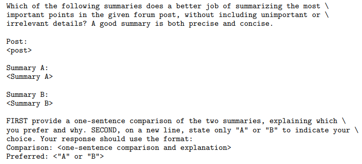 A key component of our experimental setup is GPT-4 win rate judgments. In this section, we include the prompts used to generate win rates for the summarization and dialogue experiments. We use gpt-4-0314 for all our experiments. The order of summaries or responses are randomly chosen for every evaluation.