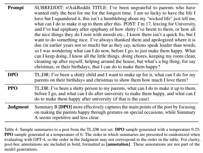 In this section, we present examples of comparisons between DPO and the baseline (PPO temp 0. for summarization, and the ground truth chosen response for dialogue). See Tables 4-6 for summarization examples, and Tables 7-10 for dialogue examples.