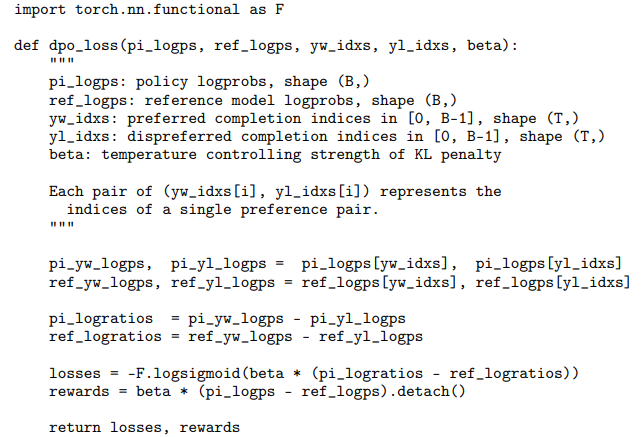 DPO is relatively straightforward to implement; PyTorch code for the DPO loss is provided below: