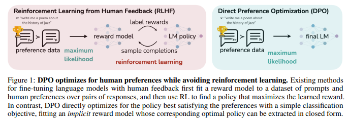 At a high level, existing methods instill the desired behaviors into a language model using curated sets of human preferences representing the types of behaviors that humans find safe and helpful. This preference learning stage occurs after an initial stage of large-scale unsupervised pre-training on a large text dataset. While the most straightforward approach to preference learning is supervised fine-tuning on human demonstrations of high quality responses, the most successful class of methods is reinforcement learning from human (or AI) feedback (RLHF/RLAIF; [12, 2]). RLHF methods fit a reward model to a dataset of human preferences and then use RL to optimize a language model policy to produce responses assigned high reward without drifting excessively far from the original model. While RLHF produces models with impressive conversational and coding abilities, the RLHF pipeline is considerably more complex than supervised learning, involving training multiple LMs and sampling from the LM policy in the loop of training, incurring significant computational costs.