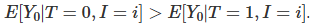 Looking at those who invest, we probably have the case that E[Y0|T=0,I=1]>E[Y0|T=1,I=1]. In words, among those who invest, the ones who manage to do so even without education are more likely to achieve high earnings, regardless of their education level. For this reason, the wage those people have, Wage0|T=0, is probably higher than the wage the educated group would have if they didn’t have education, Wage0|T=1. A similar reasoning can be applied to those who don’t invest, where we also probably have E[Y0|T=0,I=0]>E[Y0|T=1,I=0]. Those who don’t invest even with education probably would have a lower wage, had they not got the education, than those who didn’t invest but didn’t have an education.