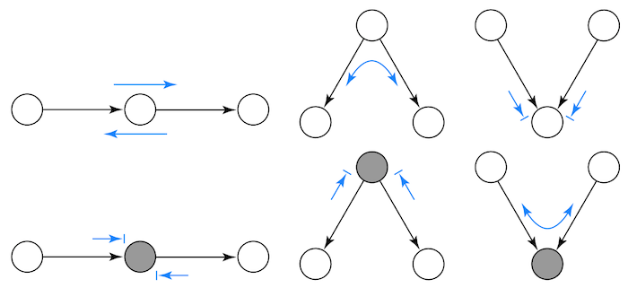 Here is a cheat sheet about how dependence flows in a graph. I’ve taken from a Stanford presentation by Mark Paskin. The arrows with lines at their tips signify independence, and the arrows without lines at their tips signify dependence.