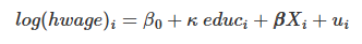 wage is affected by education, which is measured by the size of κ and by additional ability factors, denoted as the vector A. If we omit ability from our model, our estimate for κ will look like this:
