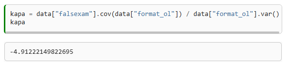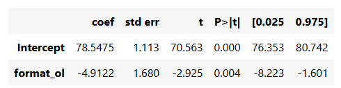 That’s quite amazing. We are not only able to estimate the ATE, but we also get, for free, confidence intervals and P-Values out of it! More than that, we can see that regression is doing exactly what it supposed to do: comparing E[Y|T=0] and E[Y|T=1]. The intercept is exactly the sample mean when T=0, E[Y|T=0], and the coefficient of the online format is exactly the sample difference in means E[Y|T=1]−E[Y|T=0]. Don’t trust me? No problem. You can see for yourself: