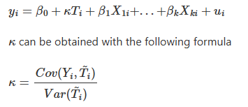 If we have more than one regressor, we can extend the following formula to accommodate that. Let’s say those other variables are just auxiliary and that we are truly interested only in estimating the parameter κ associated to T.