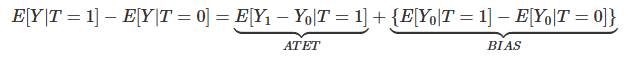 Let’s also recall that we can’t simply estimate E[Y1−Y0] with the difference in mean E[Y|T=1]−E[Y|T=0] due to bias. Bias often arises when the treated and untreated are different for reasons other than the treatment itself. One way to see this is on how they differ in the potential outcome Y0