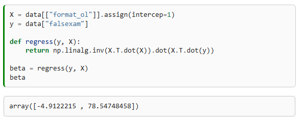 Lets see how this beauty works. In the code below, we want to run the exact same analysis of comparing online vs face-to-face classes. But instead of doing all that math of confidence intervals, we just run a regression. More specifically, we estimate the following model: