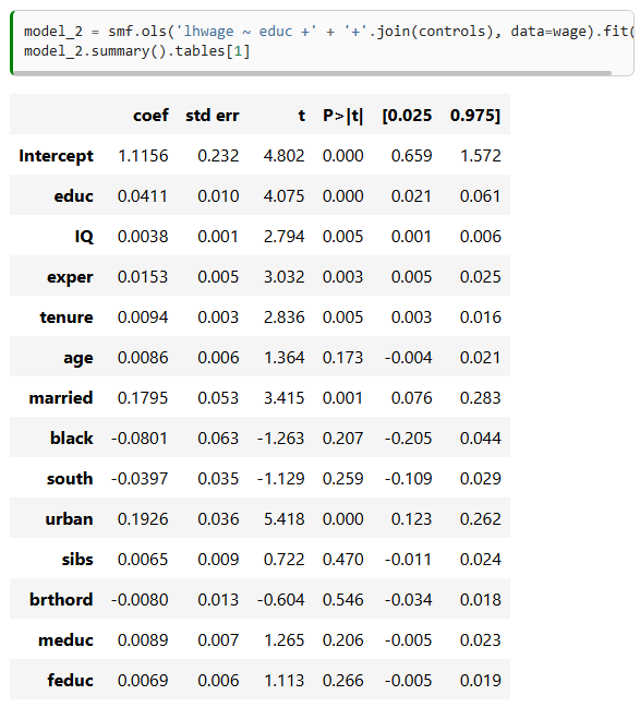 This formula says that we can predict educ from the parents’ education, from IQ, from experience and so on. After we do that, we’ll be left with a version of educ, educ~, which is uncorrelated with all the variables included previously. This will break down arguments such as “people that have more years of education have it because they have higher IQ. It is not the case that education leads to higher wages. It is just the case that it is correlated with IQ, which is what drives wages”. Well, if we include IQ in our model, then κ becomes the return of an additional year of education while keeping IQ fixed. Even if we can’t use randomised controlled trials to keep other factors equal between treated and untreated, regression can do this by including those same factors in the model, even if the data is not random!