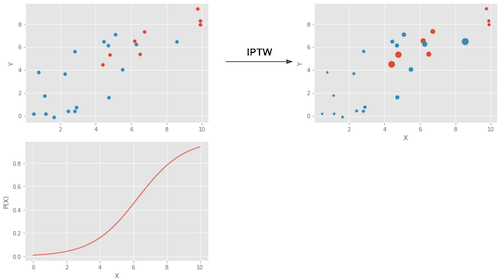 The upper left plot shows the original data. The blue dots are the untreated and the red dots are the treated. The bottom plot shows the propensity score e(x). Notice how it is between 0 and 1 and it grows as X increases. Finally, the upper right plot is the data after weighting. Notice how the red (treated) that are more to the left (lower propensity score) have a higher weight. Similarly, the blue plots that are to the right have also a higher weight.