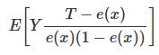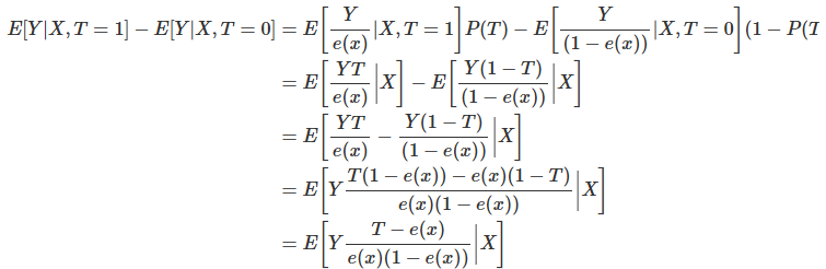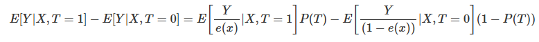 We can simplify this further, but let’s take a look at it like this because it gives us some nice intuition of what the propensity score is doing. The first term is estimating Y1. It is taking all those that are treated and scaling them by the inverse probability of treatment. What this does is it makes those with very low probability of treatment have a high weight. This makes sense, right? If someone has a low probability of treatment, that individual looks like the untreated. However, that same individual was treated. This must be interesting. We have a treated that looks like the untreated, so we will give that entity a high weight. This creates a population with the same size as the original, but where everyone is treated. By the same reasoning, the other term looks at the untreated and gives a high weight to those that look like the treated. This estimator is called the Inverse Probability of Treatment Weighting (IPTW), since it scales each unit by the inverse probability of the treatment it received.