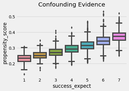 We can also use the propensity score to find evidence of confounding. If a segmentation of the population has a higher propensity score than another, it means that something which is not random is causing the treatment. If that same thing is also causing the outcome, we have confounding. In our case, we can see that students that reported to be more ambitious also have a higher probability of attending the growth mindset seminar.