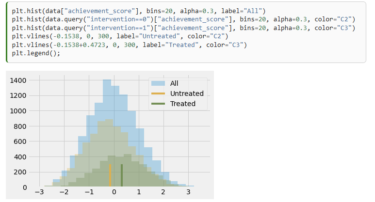 Simply comparing those with and without the intervention, we can see that the treated have an achievement score that is, on average, 0.3185 (0.4723 - 0.1538) higher than the average score (which is zero, since the score is standardized). But is this big or small? I know that interpreting standardized outcomes can be challenging, but bear with me for a moment. I think it is worth going through this because it won’t be the last time you will encounter standardized scores.