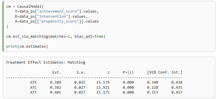 As we can see, we also get an ATE of 0.38, which is more in line with what we’ve seen before with propensity score weighting. Matching on the propensity score also gives us some intuition about why it is dangerous to have a small overlap in the propensity score between treated and untreated. If this happens, the matching on the propensity score discrepancy will be large, which will lead to bias, as we’ve seen on the matching chapter.