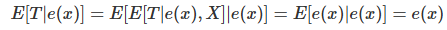 The first equality comes from the law of iterated expectations. The second comes from what we’ve figured out when dealing with the left hand side. Since both the left and right hand side equals, e(x), this equation is trivially true.