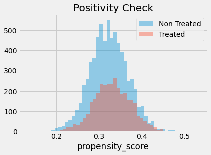 We also have to check that there is overlap between the treated and untreated population. To do so, we can see the empirical distribution of the propensity score on the untreated and on the treated. Looking at the image below, we can see that no one has a propensity score of zero and that even in lower regions of the propensity score we can find both treated and untreated individuals. This is what we call a nicely balanced treated and untreated population.