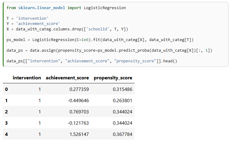 As you can see, the propensity score estimator that adds the feature school has a humongous variance, while the one without it is much more well behaved. Also, since school is not a confounder, the model without it is also not biased. As I’ve said, simply predicting the treatment is not what this is about. We actually need to construct the prediction in a way that controls for confounding, not in a way to predict the treatment.