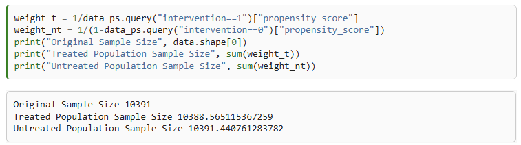 If this happens, it means that positivity is not very strong. If a treated has a propensity score of, say, 0.9 and the maximum propensity score of the untreated is 0.7, we won’t have any untreated to compare to the individual with the 0.9 propensity score. This lack of balancing can generate some bias, because we will have to extrapolate the treatment effect to unknown regions. Not only that, entities with very high or very low propensity scores have a very high weight, which increases variance. As a general rule of thumb, you are in trouble if any weight is higher than 20 (which happens with an untreated with propensity score of 0.95 or a treated with a propensity score of 0.05).