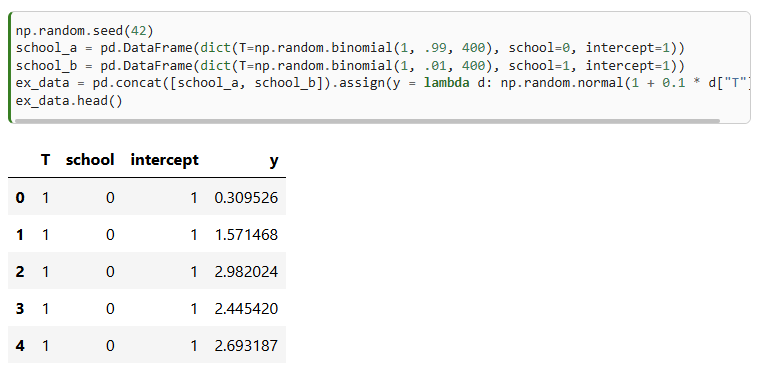 To see this, consider the following example (adapted from Hernán’s Book). You have 2 schools, one of them apply the growth mindset seminar to 99% of its students and the other to 1%. Suppose that the schools have no impact on the treatment effect (except through the treatment), so it’s not necessary to control for it. If you add the school variable to the propensity score model, it’s going to have a very high predictive power. However, by chance, we could end up with a sample where everyone in school A got the treatment, leading to a propensity score of 1 for that school, which would lead to an infinite variance. This is an extreme example, but let’s see how it would work with simulated data.