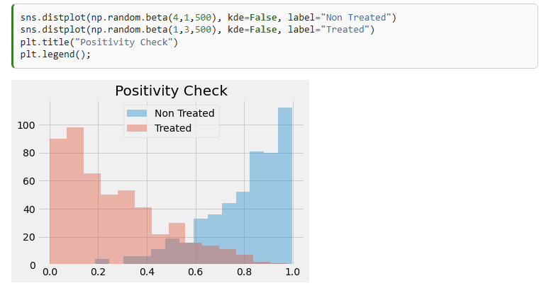Notice that this estimator requires that e(x) and 1−e(x) are larger than zero. In words, this means that everyone needs to have at least some chance of receiving the treatment and of not receiving it. Another way of stating this is that the treated and untreated distributions need to overlap. This is the positivity assumption of causal inference. It also makes intuitive sense. If treated and untreated don’t overlap, it means they are very different and I won’t be able to extrapolate the effect of one group to the other. This extrapolation is not impossible (regression does it), but it is very dangerous. It is like testing a new drug in an experiment where only men receive the treatment and then assume women will respond to it equally well.