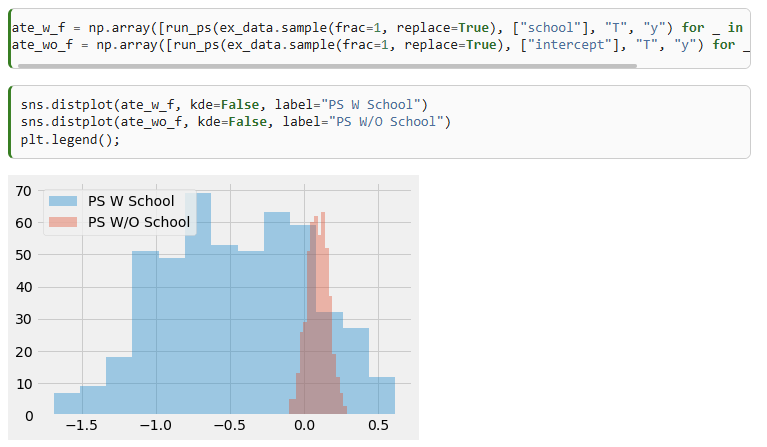 Having simulated this data, we run bootstrap with the Propensity Score algorithm twice. The first including school as a feature to the propensity score model. The second time, we don’t include school in the model.