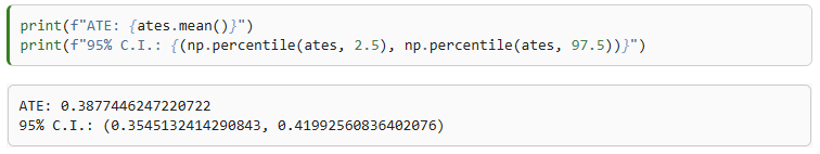 The ATE is then the mean of the bootstrap samples. To get confidence intervals, we can inspect the quantiles of the bootstrap distribution. For the 95% C.I., we use the 2.5 and 97.5 percentiles.