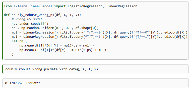 But don’t take my word for it. Let the code show you the way! In the following estimator, I’ve replaced the logistic regression that estimates the propensity score by a random uniform variable that goes from 0.1 to 0.9 (I don’t want very small weights to blow up my propensity score variance). Since this is random, there is no way it is a good propensity score model, but we will see that the doubly robust estimator still manages to produce an estimation that is very close to when the propensity score was estimated with logistic regression.