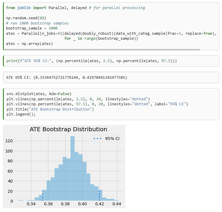 Doubly robust estimator is saying that we should expect individuals who attended the mindset seminar to be 0.388 standard deviations above their untreated fellows, in terms of achievements. Once again, we can use bootstrap to construct confidence intervals.