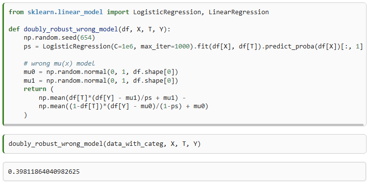 Once again, if you believe more in code than in formulas, here it is the practical verification. In the code below, I’ve replaced both regression models with a random normal variable. There is no doubt that μ^(Xi) is not correctly specified. Still, we will see that doubly robust estimation still manages to recover the same ATE^ of about 0.38 that we’ve seen before.