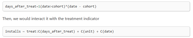 Notice however that this is tricky to implement with formulas, so we have to do some feature engineering first. Namely, we will create the cohort dummies by hand, making one column which is 1 when the cohort is 2021-06-01 and 0 otherwise and another column which is 1 when the cohort is 2021-07-15 and 0 otherwise. Also, we will create a date column for cohort 2021-06-01 which collapses all dates before that cohort date to a control category. We can do a similar thing with the dates from the 2021-07-15 cohort. Here is what this looks like in code.
