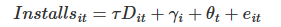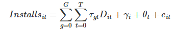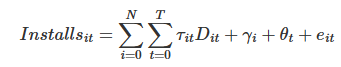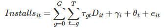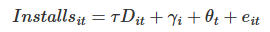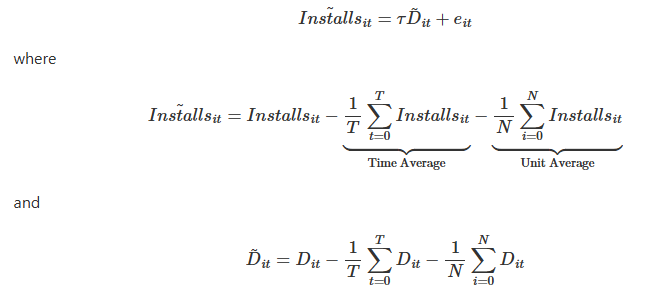 Estimating the above model with OLS is what is called the Two-Way Fixed Effects Model (TWFE). Notice that τ would be the treatment effect, as it tells us how much installs changes once units are treated.