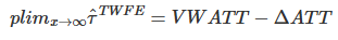 The first term is the variance weighted ATT from multiple DiD comparisons like the ones we saw earlier. This is what we want. However, there is also that extra ΔATT term there. This represents how much the ATT changes over time and it is what bias our estimate. Looking at this term, we can see that we will have downward bias if the magnitude of the effect increases with time (like in our example) or upward bias if the magnitude of the effect decreases with time.