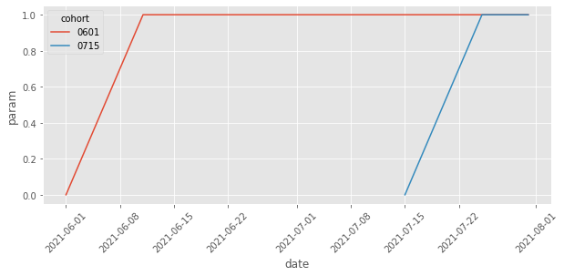 The group of cities that got the feature (got treated) at a specific point in time is called a cohort. In our case, we have three cohorts: one that got treated in 2021-06-01, another that got treated in 2021-07-15 and a control cohort, which only gets treated after the end of our data. To get a sense of what this data looks like, let’s plot the average daily installs grouped by cohort.