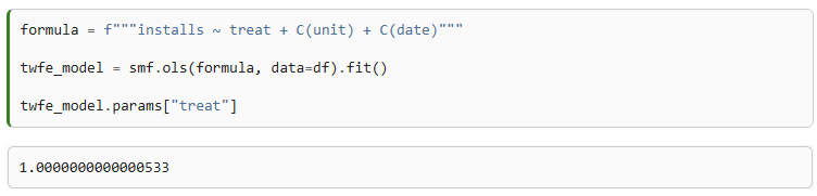 To see all this power in action all we have to do is run an OLS model with the treatment indicator D (treat here), plus dummies for the units and time. In our particular example, I’ve generated data in such a way that the effect of the treatment (new feature) is to increase installs by 1. Notice how TWFE can recover that treatment effect perfectly: