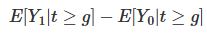 Ideally, to infer the effect of the rollout of this new feature on installs, we want to know what would have happened to the cohorts that got the feature, had they not got it. We want to estimate the counterfactual outcome Y(0) in the post treatment periods for the treated cohorts. If we denote each cohort by the time it got treated g (remember that a cohort is just a group of cities that got treated at the same time), we can write this counterfactual as E[Y0|t≥g], which would then allow us to define the treatment effect on the treated (the ATT) for cohort g as follows: