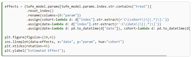 As we can see, the counterfactual Y0 prediction falls right where we think it should fall, that is, pretty close to the control cohort. This is very comforting. We know that the TWFE model is estimating the treatment effect as Y−Y0^. That is, it is simply comparing the outcome from the treated cohorts to that counterfactual. Since the counterfactual seems OK, we can rest assured that the treatment effect is also probably OK.