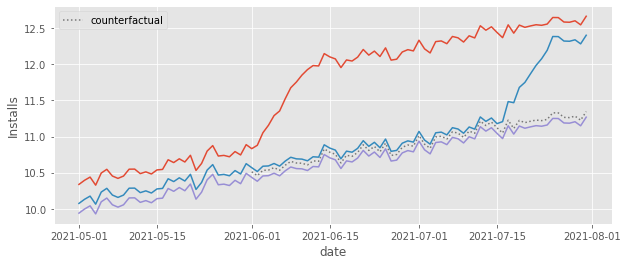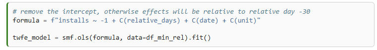 Then, we can pass that column as a category so our model will estimate the expected number of installs for each period relative to the treatment. We can then define the effect as the extra expected number of installs compared to relative day -1, which is the last day prior to the treatment.