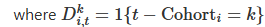 Ok, now, we need to reduce the number of treatment effect parameters of the model. To achieve that, we can think about a way of somehow grouping units. If we think about this a bit, we can see a very natural way to group units: by cohort! We know that the effect in an entire cohort follows the same pattern over time. So, a natural improvement on that impractical model above is to allow the effect to change by cohort instead of units: