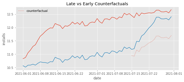 The first three comparisons are no reason for concern, mostly because what they use as control is very well behaved. However, the fourth comparison, late vs early, is problematic. Notice that this comparison uses the early treated as a control. Also notice that this early treated control has a weird behavior. It climbs up sharply at the beginning. That is a reflection of our ATT not being instantaneous, but instead taking 10 days to mature. Intuitively, we can see that this will mess up the estimation of the counterfactual trend in the DiD, making it steeper than it should be. To visualize that, let’s plot the estimated counterfactual Y0 for the late treated in this 4th group.