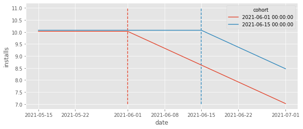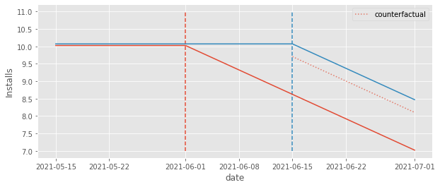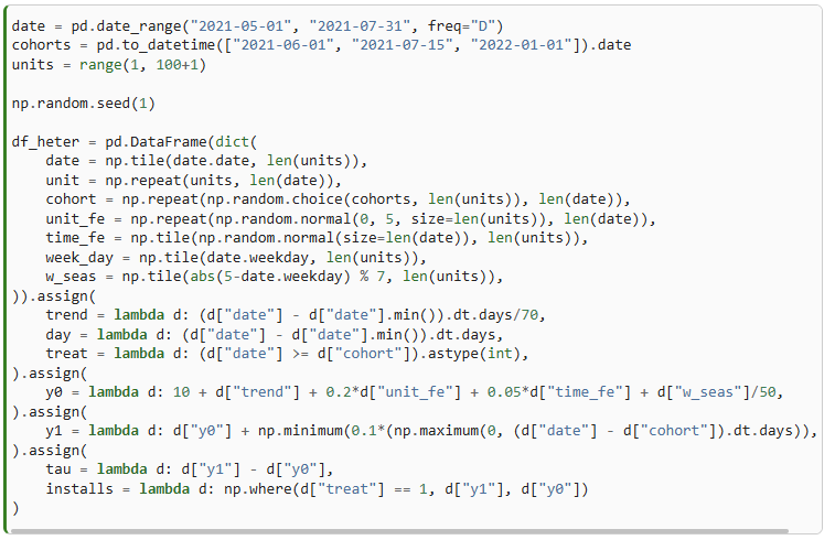 However, I think we can stop here. Not allowing heterogeneity by cohort is, more often than not, a bad idea, since treatment effect tends to change over calendar time, not only over time since the treatment. For example, it could be that, after some time, competitors copy our feature making it no longer a strong customer attractor as it once was. In that case, the effect of the new feature on installs would diminish over time.