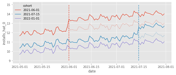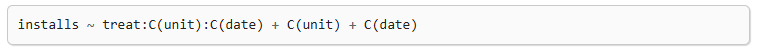 To include the treatment in this picture, let’s define a variable Dit which is 1 if the unit is treated and zero otherwise. In our example, this variable would be always zero for the never treated cohort. It would also be zero for all the other cohorts at the beginning, but it would turn into 1 at 06/01 for the cohort treated on 06/01 and stay at 1 after that. Also, it would turn into 1 at 07/15 for the cohort treated on 07/15. We can include those treatment indicators in our model of installs as follows: