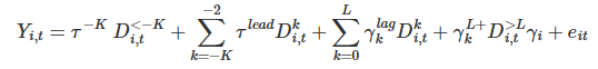 We can solve this problem by what is called an event study design, where we add one dummy for each period before and after the treatment. In this case, we replace the original TWFE model by