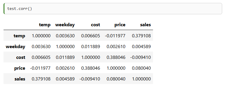 If we show the correlations on the test set, we can see that price is positively correlated with sales, meaning that sales should go up as we increase prices. This is obviously nonsense. People don’t buy more if ice cream is expensive. We probably have some sort of bias here.