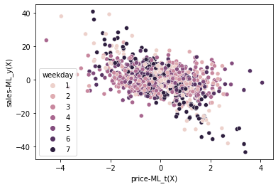 We can see that the weekends are no longer to the upper right corner. They got pushed to the center. Moreover, we can no longer differentiate between different price levels (the treatment) using the weekdays. We can say that the residual price−Mt(X), plotted on the x-axis, is a “random” or debiased version of the original treatment.