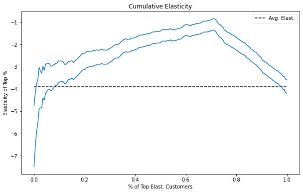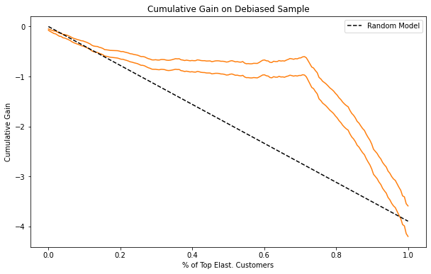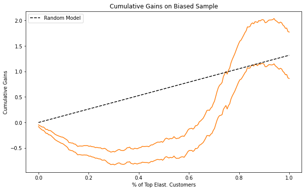 First thing you should notice is that the average elasticity goes up, instead of down. We’ve seen this before. In the biased data, it looks like sales goes up as price increases. As a result, the final point in the cumulative gain plot is positive. This makes little sense, since we now people don’t buy more as we increase ice cream prices. If the average price elasticity is already messed up, any ordering in it also makes little sense. The bottom line being that this data should not be used for model evaluation.