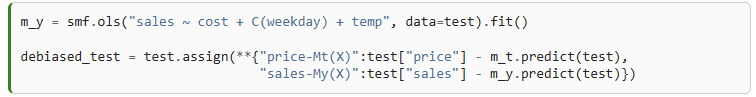 To debias this dataset we will need two models. The first model, let’s call it Mt(X), predicts the treatment (price, in our case) using the confounders. It’s the one of the stages we’ve seen above, on the Frisch–Waugh–Lovell theorem.
